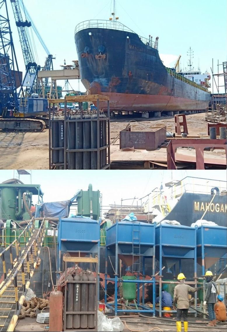 the process of blasting and painting on a ship’s surface. Before painting begins, the old layers of paint and rust are removed through blasting, using high-pressure abrasive materials to clean the steel surface thoroughly. Once the surface is perfectly clean, the painting process starts to protect the ship from corrosion, seawater damage, and harsh weather conditions. Every step requires skill and precision because the quality of the blasting and coating directly affects the ship’s durability and appearance. This photo gives a closer look at one of the most important stages in ship maintenance, where workers make sure the vessel is ready to face the challenges of the open sea.